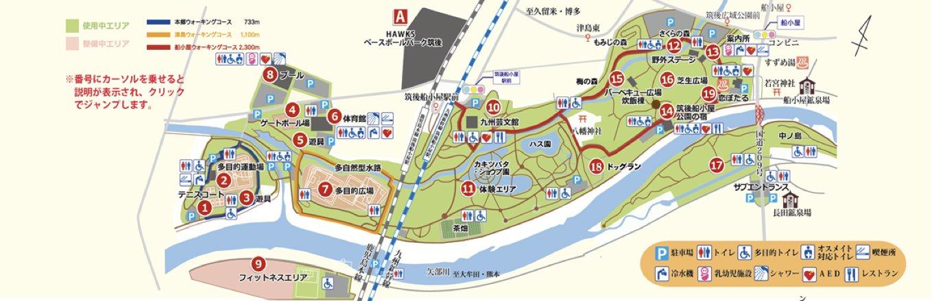 ①「筑後広域公園」は、筑後市の船小屋中ノ島エリアを中心に、みやま市まで広がる、東西約4キロメートルにわたって都市計画決定された県営筑後広域公園です。