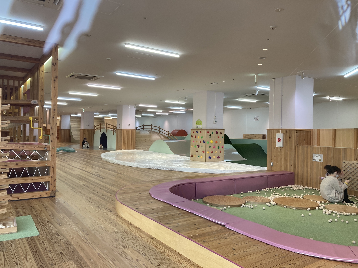 1階には「ひばっこ保育園」や「KIRI no KO(きりのこ)」という遊び場も併設されており、子どもたちも利用できる施設となっています。また、敷地内には足湯もあり、家族連れや観光客など、誰もが楽しめる空間としてにぎわっていました。